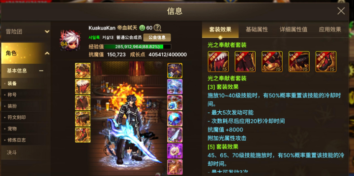 这次隔壁服也是迎来大更新,除了和国服一样新增加了2件装备栏耳环和魔法石之外,而且还扩展等级到了85级了。这也是让隔壁服玩家的抗魔值也是得到了大提升,这不隔壁服还没更新多久就有玩家已经是达到了15万抗魔值了,这是目前全服抗魔最高的玩家了吧。可以看到这名玩家的运气也是很不错的,凑齐了一套新史诗套广之奉献套,也就是国服的镇魂套。再加上新的附魔宝珠和新装备的加持,这名玩家才能突破15万抗魔值。