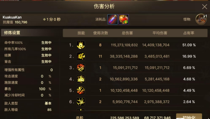 而且这名玩家的伤害也是非常恐怖的,在修炼场测试后发现,这套装备刷起来是真的太爽了,技能一直刷新。这一分钟内这名玩家都放了8次大蹦了啊,运气好甚至可以实现无限大蹦。虽然说这套装备对于伤害的加成并不高,单次大蹦平均也才144亿的伤害,但这架不住这释放的频率这么高啊。而这大蹦也是打出了1152亿的恐怖伤害,果然还是太强了。