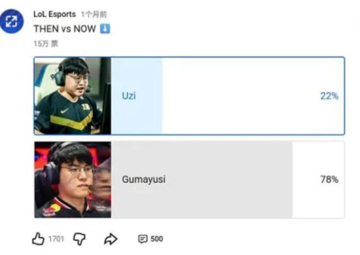 也正因如此,有人觉得这个结果不合理,认为Uzi的个人实力不该只值22%,但必须承认,投票本身并不是“历史排名”,而是大众偏好的即时呈现,随着时间推移,新一代观众对Uzi的印象更多停留在集锦和传说,而Gumayusi仍在用冠军不断刷新存在感,票数差距自然会被拉大。