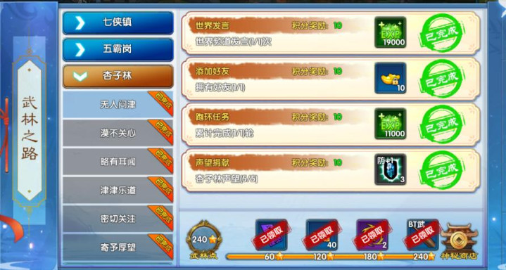 17级开启的武林之路系统,按指引完成任务就能收获丰厚经验,是前期升级的重要助力。每日必做除暴安良任务,组满5人队伍效率更高,最后一环有概率触发精英怪,击杀后经验直接翻倍,不容错过。