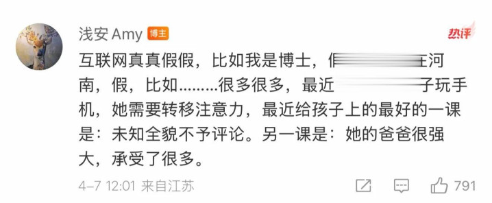 李丽婧现身评论区,还针对谣言做出了澄清,全文如下:“互联网真真假假,比如我是博士,假,比如我在河南,假,比如………很多很多,最近没有控制孩子玩手机,她需要转移注意力,最近给孩子上的最好的一课是:未知全貌不予评论。另一课是:她的爸爸很强大,承受了很多。”