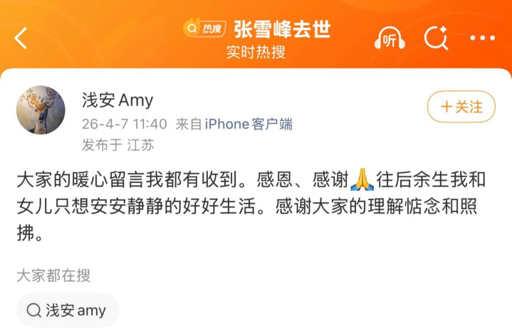 4月7日,张雪峰前妻在社交平台发文称:“大家的暖心留言我都有收到。感恩、感谢往后余生我和女儿只想安安静静的好好生活。感谢大家的理解惦念和照拂”,这也是张雪峰离开后,她首次发文。