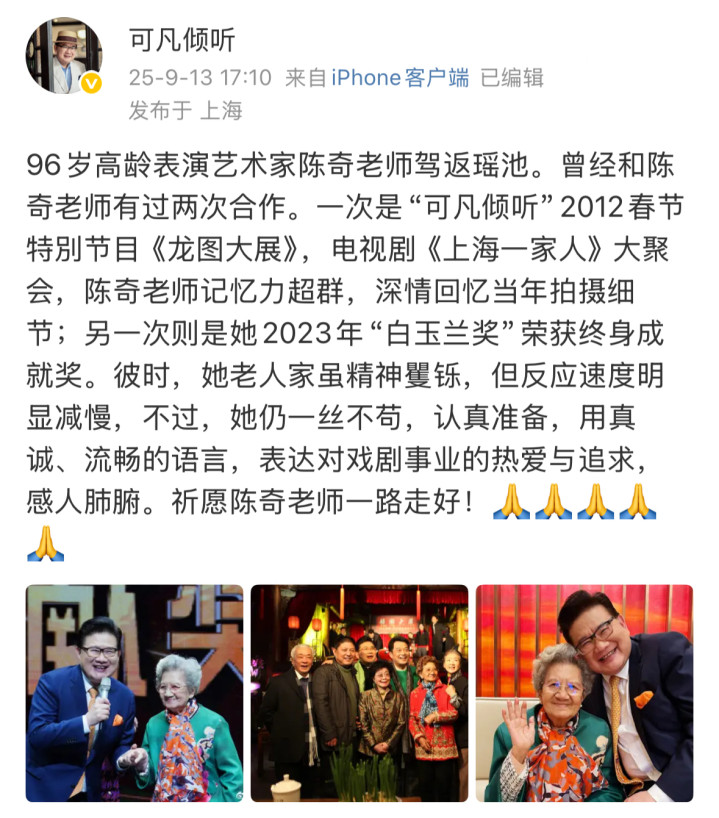9月13日,娱乐圈再度传来噩耗,著名表演艺术家陈奇逝世,享年96岁,圈内后辈曹可凡发文悼念。