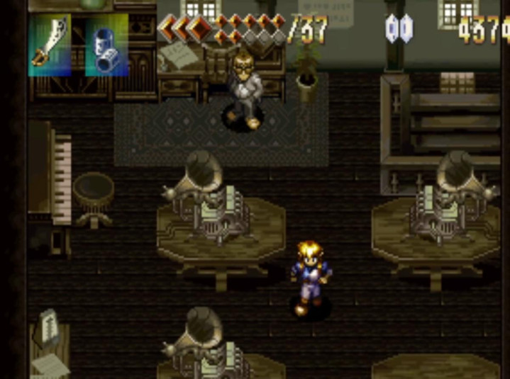 本作在流程中还加入了大量2D动画交代故事情节,这也是进化到光盘媒体后游戏的必备要素,此外游戏的配乐对烘托冒险氛围起到了极佳的推动作用,作曲家田中公平最知名游戏作品,就是《樱花大战》主题曲,经历过32位主机时代的老玩家可以说耳熟能详,他为《阿兰多拉》创作了二十余首精美曲目,除了通过单独发售的原声音乐CD欣赏外,你在游戏中还可以找到一位名字造型和田中大师都很像的NPC,对话后即可选择曲目聆听,可以说是非常有意思的彩蛋。