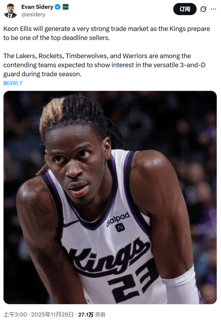 《福布斯体育》NBA记者Evan Sidery谈到了国王后卫、防守悍将基翁-埃利斯的交易行情。他表示,基翁-埃利斯将会在交易市场上掀起一股热潮,因为国王队准备成为交易截止日前的主要卖方之一。其中,湖人、火箭、森林狼和勇士等争冠球队会在交易期内对这位全能3D后卫表现出兴趣。